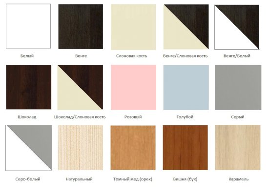 Возможные цвета кроваток: белый, слоновая кость, венге, венге/слоновая кость, венге/белый, шоколад, шоколад/слоновая кость, розовый, голубой, серый, серо-белый, натуральный, темный мед (орех), вишня (бук), карамель.