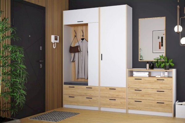 Шкаф оснащен полкой для хранения вещей, которая открывается с помощью газлифтов, которые которые фиксируют положение фасада в открытом виде, а также двумя выдвижными ящиками с шариковыми направляющими, за счет которых они выдвигаются плавно и бесшумно. В комплект модуля входит также мягкий элемент в цвет фасада и позволяет использовать часть шкафа в качестве посадочного места при сборах. За распашной дверкой удобно разместить ключи, документы и прочие принадлежности. Шкаф является модульным, что позволяет комбинировать его с другими шкафами и тумбами из одноименной коллекции. Лаконичный дизайн шкафа гармонично подчеркивается черными ручками. Сборка шкафа универсальна – распашная дверь может крепиться как на правую, так и на левую стороны.