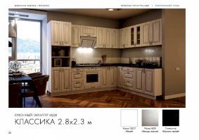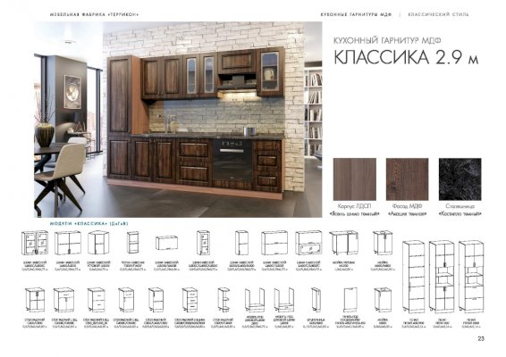 Поклонники сдержанных форм и элегантного оформления обязательно оценят кухонный гарнитур «Классика». Мебель отличается неброской, стилизованной под натуральную древесину отделкой, аккуратными ручками на дверцах ящиков и шкафов, практичной и удобной конструкцией. Из отдельных модулей покупатели могут собрать комплект подходящей конфигурации.
