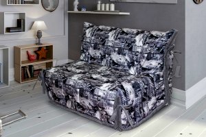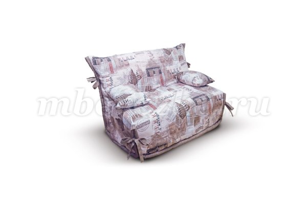 Недорогой малогабаритный диван. Чехол в светлых оттенках, с завязками контрастного цвета. Его можно использовать в качестве покрывала для кровати, в которую миниатюрный диван превращается в разложенном виде. По мере загрязнения чехол можно стирать – он выполнен из тканей, устойчивых к механическим воздействиям и выцветанию, и долгие годы не потеряет свежести внешнего вида.