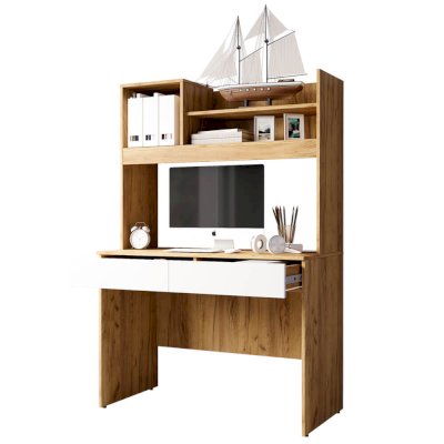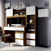 Стильный письменный стол Селфи станет украшением любого рабочего пространства. Модель выполнена в цвете крафт в гармоничном сочетании с белым. В выдвижных ящиках и нишах над столешницей получится разместить все необходимые для работы или учебы вещи.