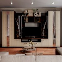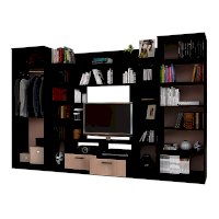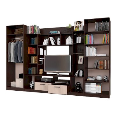 Гостиная Венеция – идеальный вариант для размещения большого количества вещей, включая одежду. ТВ-зона, выдвижные ящики и открытые полки гармонично вписаны в дизайн гостиной.