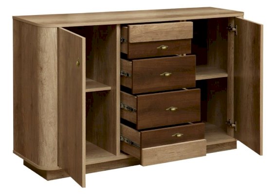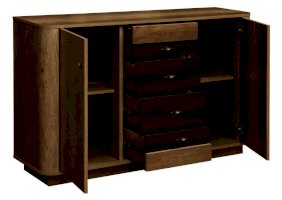 Классический комод – большой, вместительный и основательный. Под столешницей, в центре, находятся четыре выдвижных ящика – один под другим. А по бокам – справа и слева – два отсека за закрытыми дверцами, которые распахиваются навстречу друг другу. В каждом отсеке по две полки из ЛДСП, каждая из которых выдерживает вес до 5 кг.