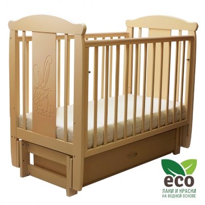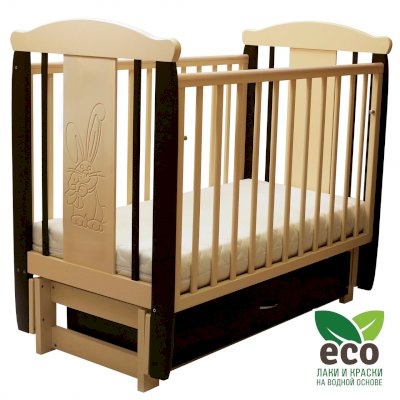 Кроватка декорирована фрезерным рисунком "Заяц с бантом". Уникальные фрезерные рисунки размером от 50 см на обеих спинках.