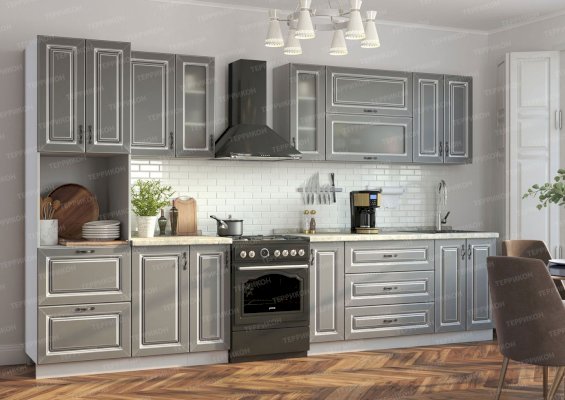 Кухонный гарнитур «Италия» воплотил в себе роскошь и эстетизм этой прекрасной средиземноморской страны. На суд покупателей представлены комплекты с отделкой под графит, платину, беленый дуб, а также великолепные модели фисташкового цвета. Шикарный вид придают дизайнерская фурнитура, дверцы шкафчиков из рифленого стекла, золоченные прямоугольники на фасадах.