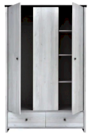 Шкаф разделен на 3 отделения. С левой стороны – за распашными дверями расположено отделение со стационарной штангой для одежды. С правой стороны – за распашной дверью отделение с полками. В нижней части шкафа 2 глубоких выдвижных ящика на металлических роликовых направляющих.