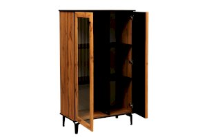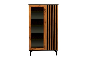 Шкаф визуально разделен на две части. В самом шкафу все просто – левое пространство за стеклом, правое – закрытое. Внутри – по три полки из ЛДСП. Каждая выдерживает вес до 5 кг. Стеклянная дверца обрамлена рамкой в цвет дерева, закрытая – с визитной карточкой коллекции –   с реечным фасадом. Они разной ширины, так как левая часть, по традиции коллекции, шире, а правая – уже. За стеклом отлично смотрится посуда и сувениры, за закрытой дверцей – книги.