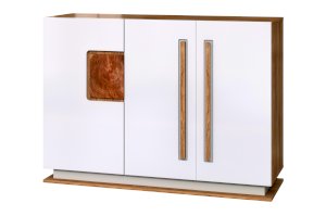 Корпус комода выполнен из ЛДСП. Фасады изготовлены из МДФ, окутанного пленкой ПВХ цвета Белый глянец. Декоративные элементы прямоугольной формы на фасадах имитируют спил дерева. Эффект древесного рисунка достигается благодаря техники УФ-печати.