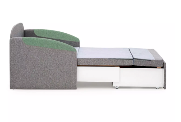 В кресле предусмотрен большой ящик. Благодаря особой конструкции ящик Polto в 2 раза глубже и вместительнее, чем ящики в аналогичных моделях. Поместится подушка, топпер и одеяло.