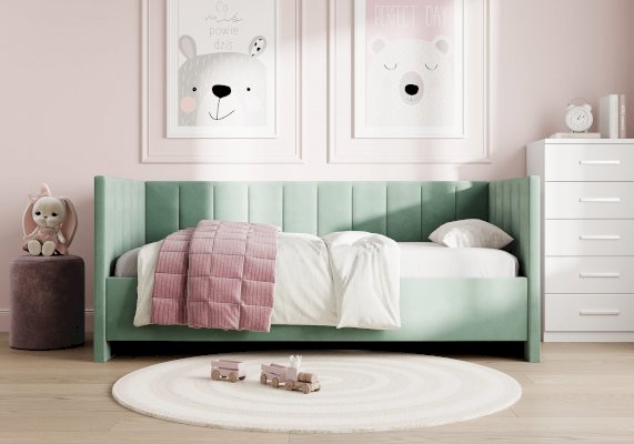 Чехол на матрас в материале кровати, обивка задней части спинки, бортик для кровати и подъемный механизм с бельевым ящиком приобретается отдельно