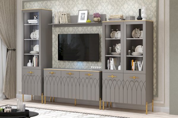 • МДФ фасады с завершающей пленкой ПВХ с поверхностью soft touch особенно популярны на рынке мебельной моды. Эффектный дизайн витрины включает фигурную фрезеровку фасадов, золотую кромку по периметру крышки, яркие металлические ручки в цвете золото.
