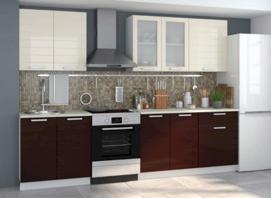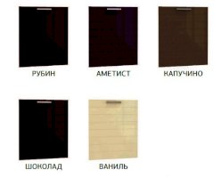 Каркасы: ЛДСП Глубина каркасов нижних шкафов - 530 мм, Глубина каркасов верхних шкафов - 320 мм. Цоколь ЛДСП - в комплекте с нижним шкафом, выдвижные ящики - метабоксы. Фасады: МДФ фрезерованная, окутанная глянцевой пленкой ПВХ. Цвета фасадов - ванильный, аметист (фиолетовый), рубин (бордовый), шоколад, капучино Витрины - матовое стекло.