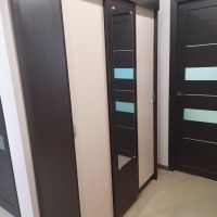 Шкаф-купе Бассо имеет хороший дизайн с зеркалом. Сочетание цвета Венге и дуба соответствует моему вкусу. На мой взгляд, довольно вместительный для небольшой квартиры, в то же время занимает немного места и гармонирует со светлой прихожей. Из недостатков: задняя стенка составляется четырьмя тонкими листами картона или очень тонкого ДСП. По инструкции ее нужно прибивать молотком, что не очень хорошо для конструкции такого хрупкого шкафа. Возникли сложности с плотность прилегание одной двери к боковой стенке. Детали, с помощью которых крепятся верхние ролики, неудобно прикрепляются к фасаду толстыми болтами. Сложно добиться ровного ровного положения роликов на фасаде. Зеркало пришлось клеить самостоятельно. Это не порадовало. В общем, наверное, шкаф хороший за такую цену и для тех, у кого не слишком дорогой ремонт в квартире.