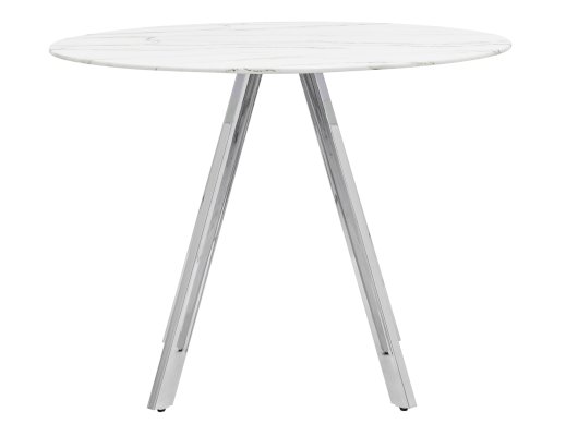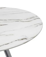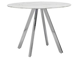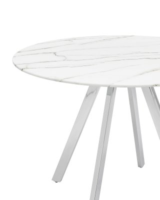 Обеденный стол с красивой стеклянной круглой столешницей белого цвета с рисунком под мрамор. Столешница гармонирует с металлическими ножками оригинальной формы. Такое сочетание смотрится эффектно в любом интерьере.